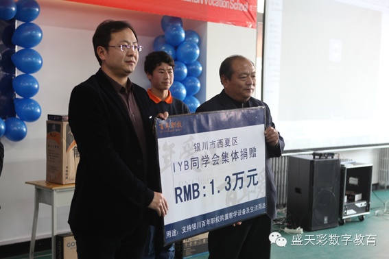 2012年12月24日,我校任立超校长组织IYB同学会集体为银川百年职校捐赠价值1.3万元的物品。捐赠中,任立超校长说:“这是我人生中第一次组织策划的公益活动,虽然捐赠的资金并不是很多,但也是我们IYB同学会每位同学的一点心意。今年我将竭尽全力调动身边资源策划一场更大的捐赠活动,希望能够让更多需要帮助的学子完成学业。同时,盛天彩从今年开始将开放一些动漫高级课程,免费为那些贫困家庭的孩子提供一个了解动漫制作、学习动漫制作的机会。”最后,任立超校长对参与此次捐赠活动的IYB同学会的每一位同学表示再次的感谢。